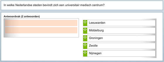 Als je het aantal goede opties aan de student wilt geven, kies dan de meer-uit-meerlimietvraag. Na het aanklikken van het aantal juiste opties, maakt TestVision automatisch een gelijk aantal vakken in een antwoordvak aan. Je hoeft in de vraag niet te noemen hoeveel opties juist zijn. Bij de keuze voor dit vraagtype maak je de vraag iets makkelijker voor studenten. Daarom is de kansscore iets hoger dan bij de meer-uit-meervraag, waarbij je het aantal juiste opties niet noemt.