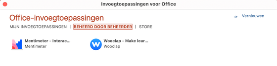 De Wooclap-invoegtoepassing (of: plug-in) voor PowerPoint is op een UMC-werkplek voorgeïnstalleerd door de dIT. Je vindt hem in PowerPoint onder het tabblad Invoegen > Invoegtoepassingen downloaden > Beheerd door beheerder.